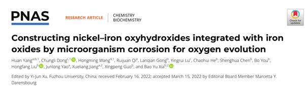 2022年5月9日,国际顶级期刊PNAS以研究长文形式刊发060net永利杨欢、江学良教授与华中科技大学化学与化工公司夏宝玉教授合作的最新研究成果《Constructing nickel–ironoxyhydroxides integrated with iron oxides by microorganism corrosion for oxygenevolution》:该文是永利官网首次以第一单位在PNAS上发表研究成果。同时也是杨欢博士在顶刊《Nature Communications》发表《Preparation of Nickel-Iron HydroxidesbyMicroorganism CorrosionforEfficient Oxygen Evolution》后的又一重大研究成果。永利官网杨欢为第一作者,台湾淡江大学董崇礼副教授、南昌大学王红明教授为共同一作,永利官网江学良教授和华中科技大学夏宝玉教授为论文的共同通讯作者。
