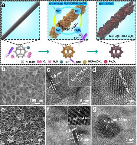 过渡金属基氢氧化物具有独特的二维层状结构、灵活调变的化学组成及优异的电催化性能等优点。因此,设计低成本、环境友好、高效的过渡金属基氢氧化物对于开发可持续的析氧催化剂具有重要意义。通常,铁掺杂到镍氢氧化物中能够改变镍中心周围的电子结构和局部环境,从而稳定中间产物并促进OER。目前,不同的制备方法如电化学沉积、水热/溶剂热被用来制备过渡金属氢氧化物。然而,这些报道的电催化剂主要从几何结构、掺杂或缺陷工程等本体调节。此外,这些方法需要在复杂的合成环境下进行精细的调控。针对上述难题,该工作采用微生物腐蚀的方法自上而下的构筑了镍铁氢氧化物纳米层,得到的腐蚀产物为氧化铁团簇与镍铁氢氧化物纳米片结合形成的生物膜电极,引入的微生物腐蚀产生的铁氧化物进一步优化了活化的羟基氧化物电极中Ni的电子结构,从而大幅提升了镍铁氢氧化物纳米层的析氧活性(图1)。