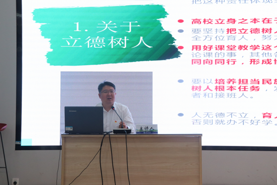 委书记王涛以《立德树人铸师魂不忘初心正师风》为题进行了专题报告,他从深刻领会习近平总书记关于新时代师德师风建设重要论述的深刻内涵、深入推进习近平总书记关于新时代师德师风建设重要论述的贯彻实施两个方面,全面系统地阐释了十八大以来习近平总书记关于师德师风的重要讲话,并勉励大家牢记立德树人根本任务与为党育人、为国育才的使命,做新时代有理想信念、有道德情操、有扎实学识、有仁爱之心的“四有”好老师。