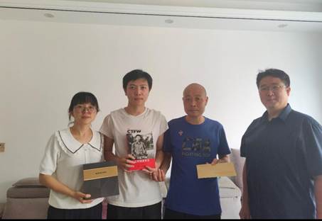 在武汉治疗期间小詹父亲一直在重症监护室无法探视,他的康复情况一直成了公司师生的牵挂,因此有了此次特别的家访。王涛给小詹父亲送上慰问金和礼物,同时送给小詹《习近平的七年知青岁月》一书,并在扉页提字,希望小詹好好读书,好好学习,天天向上,鼓励小詹要把这件事看成人生的磨砺,以后遇到困难就会勇往直前、充满勇气,相信日子会越过越好的。张琼询问了小詹的学习计划,得知小詹打算考研时,她鼓励小詹学好专业知识,特别是数学英语,为将来考研打下坚实基础。