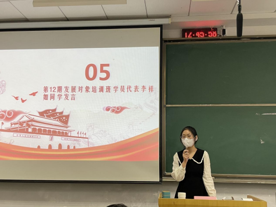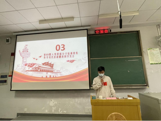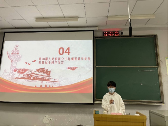 典礼上,第69期积极分子培训班优秀学员代表胡鹏涛、第70期积极分子培训班新学员代表陈冠生、第12期发展对象培训班学员代表李祥如分别做了交流发言。