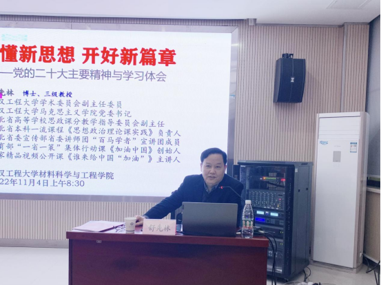 舒先林以《学懂新思想开好新篇章》为题,从党的二十大及报告的战略意义、党的二十大报告框架结构及关键词、报告中的新观点新论断新思想三个方面全面解读党的二十大主要精神并分享学习体会。他强调党的二十大是关键时刻召开的一次十分重要的大会、事关党和国家前途命运和民族伟大复兴的大会、充分彰显中国共产党成熟与自信的大会,并从七个方面总结党的二十大报告的重要地位。重点围绕前言、以15个大标题展示的报告主体部分、结束语三大板块解读报告内容,运用关键词词频、词云图、科学思维与关键词表述等方式生动形象地突出报告要点。对照十九大报告内容,总结了25个党的二十大报告中的新观点新论断新思想。