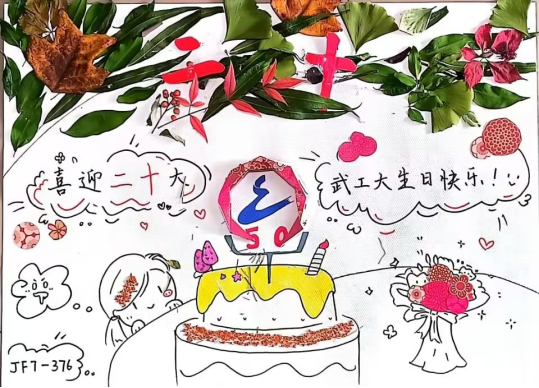 以蛋糕做底庆贺建校50周年,树叶和草代表在党和国家的关爱下,人民生活欣欣向荣,中间倒着的月亮拥抱着校徽代表党和国家的光芒照耀工大校园,青年老员工在这美好时代矢志奋斗。