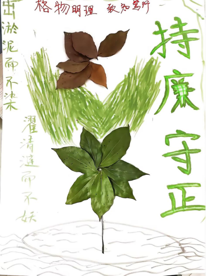 清正廉洁以身垂范,慎独自重洁身自强。作品中左侧的枝桠树叶既代表着清正廉洁施行下的中国枝繁叶茂、蓬勃发展。又代表着给人民带来的庇荫,为人民谋幸福;右侧是“清正廉洁”四个字中,“清”字带有毛笔字的古韵古味,体现出“清正廉洁”是中华民族的优良传统,源远流长,而“廉”字以荷花34的形态展示出来,以莲的品性比如“廉洁”的可贵品德。