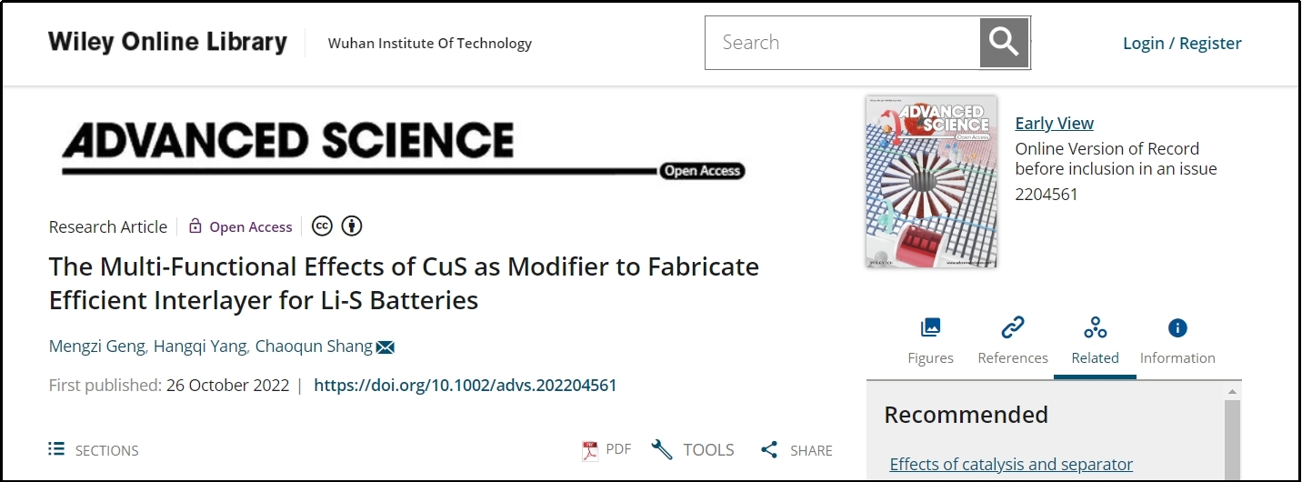 (通讯员:刘凡)近日,公司先进储能材料与器件团队商超群博士基于锂硫电池的深入研究,提出了一种改善电池性能的新思路,并通过理论分析和实验表征,对其可行性进行了验证,相关结果以"The Multi-Functional Effects of CuS as Modifier to FabricateEfficient Interlayer for Li-S Batteries"为题发表在国际知名学术期刊《Advanced Science》(响因子为17.52,中科院一区TOP)上。永利官网为论文第一单位,商超群博士为唯一通讯作者。