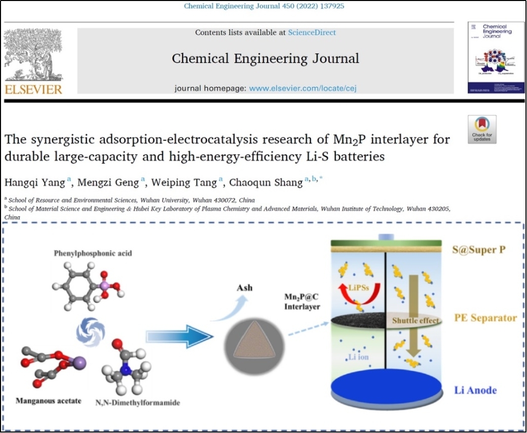 (2)依据多孔非晶碳层对多硫化锂的物理吸附作用、Mn2P对多硫化锂的强化学结合力和能够增快固液相转化与Li2S成核生长动力学的机理,将低成本原位碳络合Mn2P球(Mn2P@C)引入锂硫电池隔膜上,使其能够有效地提高硫物种的利用率,这项研究为具备高能量密度和效率的商业化锂硫电池设计提供了一定的见解,相关结果以"The synergistic adsorption-electrocatalysis research of Mn2P interlayer for durable large-capacity and high-energy-efficiency Li-S batteries"为题发表在《Chemical Engineering Journal》(影响因子为16.74,中科院一区TOP)。