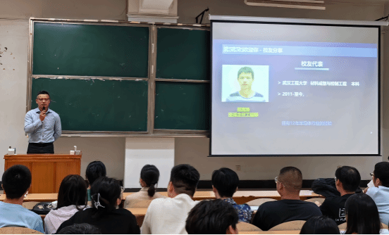刘选军师兄从企业愿景出发展开了此次企业宣讲,他首先向同学们介绍了企业核心产品的构成,制造工序,从专业上拓宽了同学们的视野,接着向大家介绍了企业的发展历程、创新型产品,充分展示了企业作为一个先进的科技公司的硬实力和科技兴国的担当作为。最后他鼓励师弟师妹们要敢于走出自己的舒适圈,勇敢追逐自己的梦想,从基层一线做起,在自己热爱的领域深耕细作,努力培养自己不可替代的核心竞争力。
